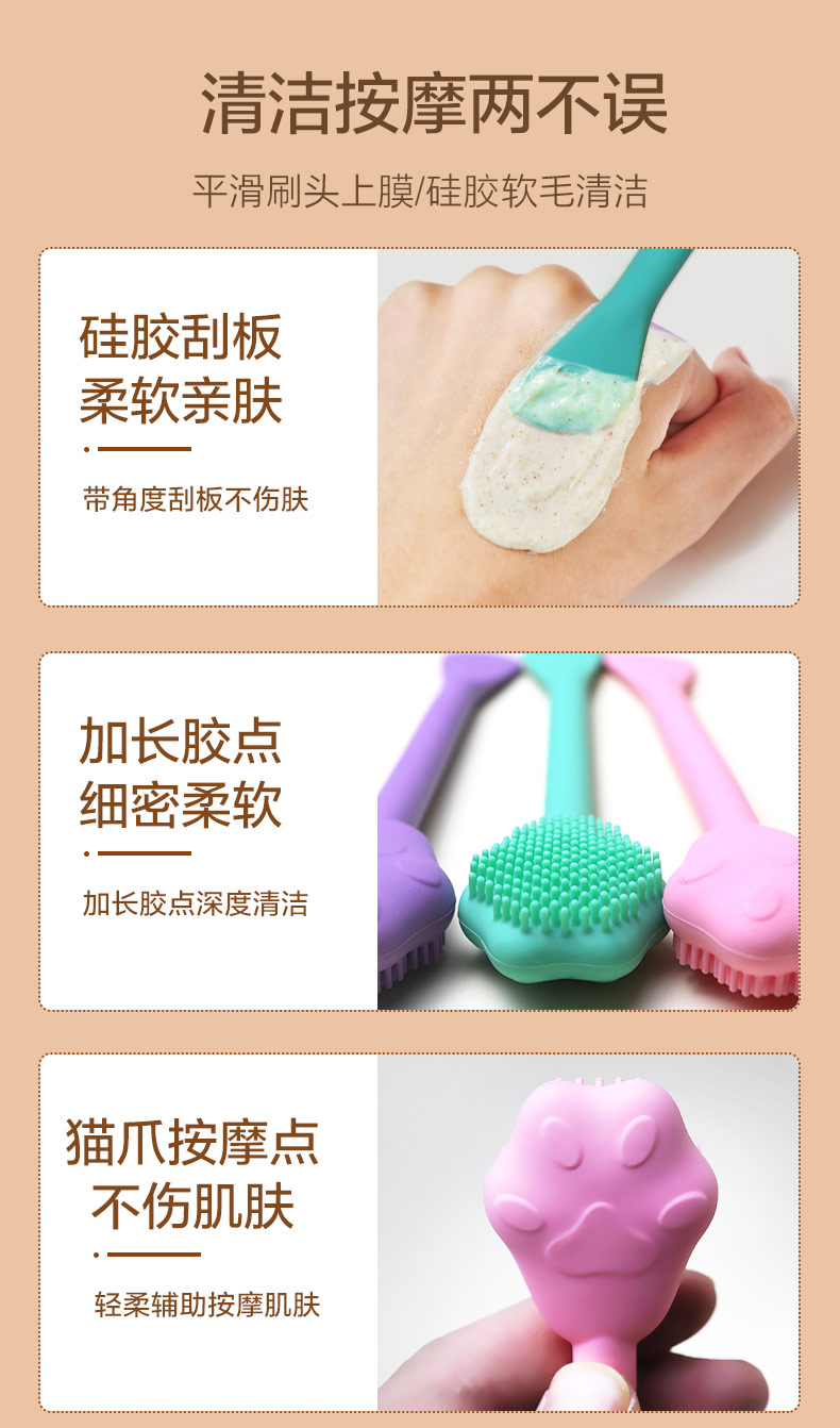 特點:柔軟硅膠,不滑不傷膚,護膚清潔二合一,無毒無害