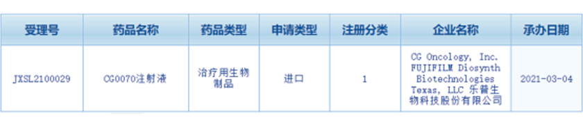 樂普生物科技股份有限公司(以下簡稱“樂普生物”)“CG0070注射液”臨床試驗申請已獲國家藥監(jiān)局藥品審評中心(CDE)受理(受理號:JXSL2100029),并于2021年3月4日公示。