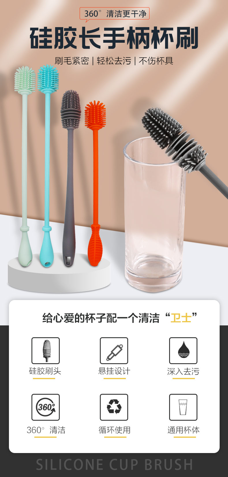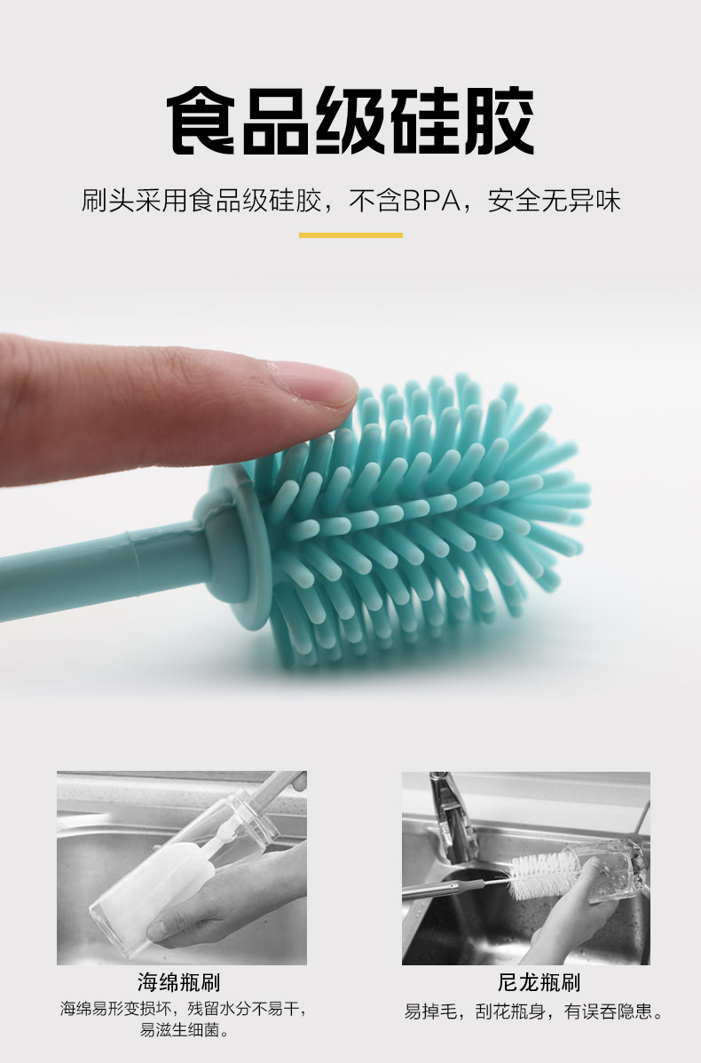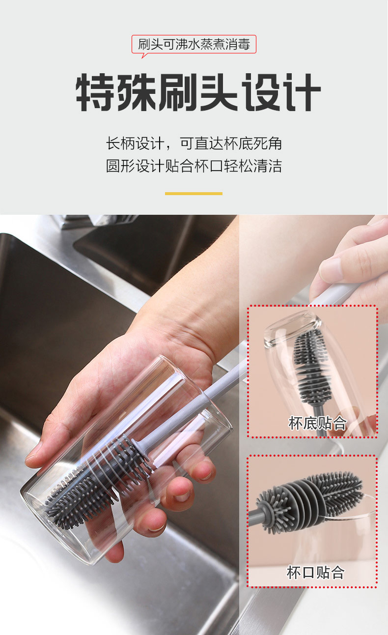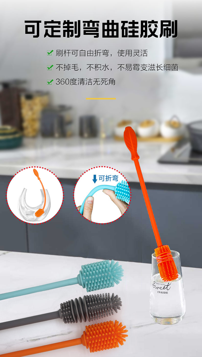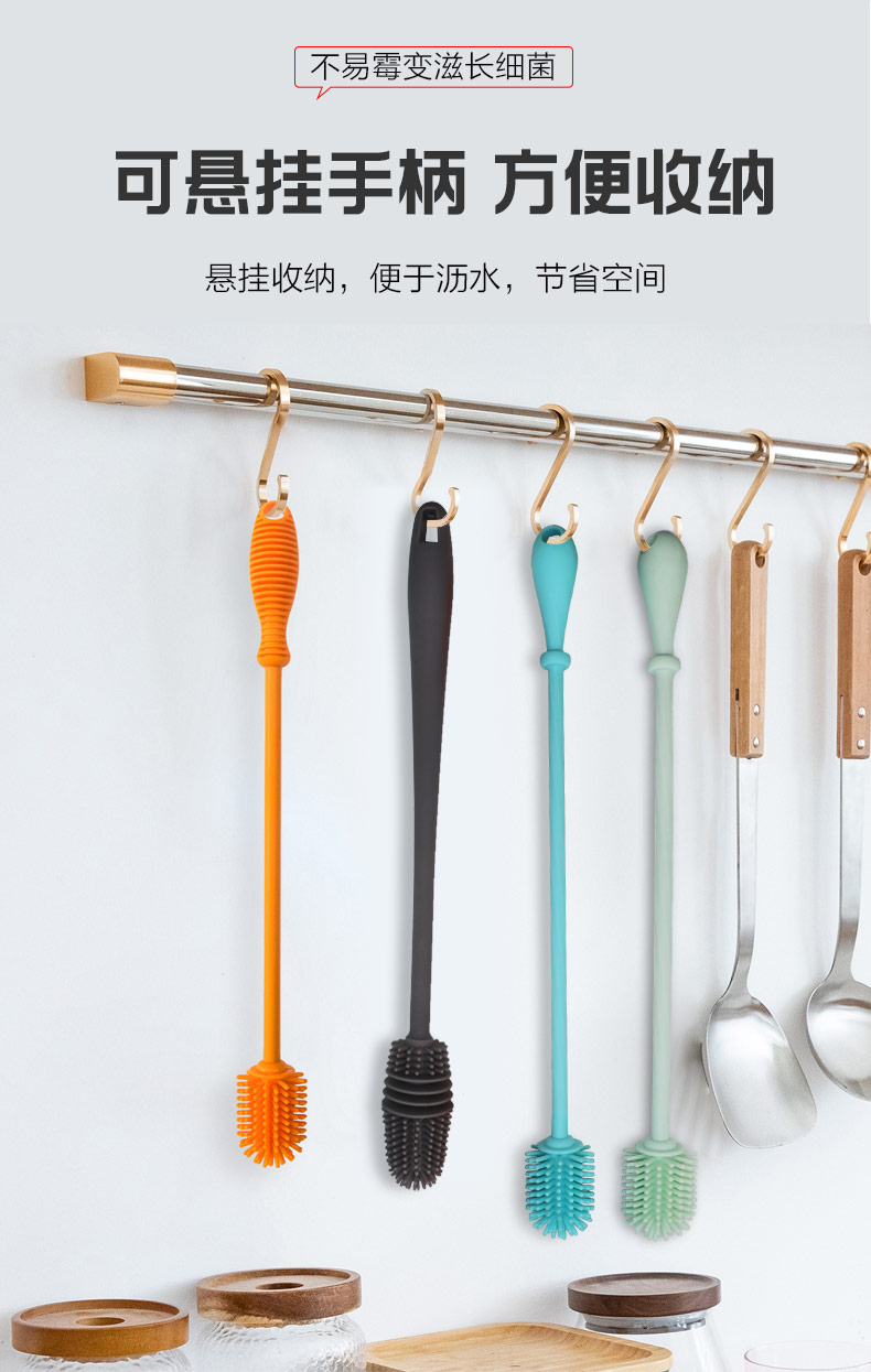 給心愛的杯子配一個(gè)硅膠刷,可以360度清潔水杯內(nèi)壁,刷頭采用食品級(jí)硅膠,不含BPA,無(wú)異味,相比海綿瓶刷不容易變形,不容易殘留水分滋生細(xì)菌。適合各類杯子的清潔。科泰利作為一家硅膠制品OEM廠家,有能力也有條件定制可彎頭的硅膠刷,人性化的設(shè)計(jì),易懸掛便利瀝水,節(jié)約空間。